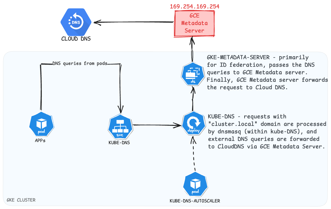 It is straightforward to understand Kube-DNS, all pods in the cluster use the Kube-DNS service for DNS resolution. Based on the request's domain Kube-DNS either forwards the request to upstream DNS servers or processes itself. In GKE by default, cluster.local is resolved by Kube-DNS itself and others are sent to the Cloud DNS via the Metadata server.