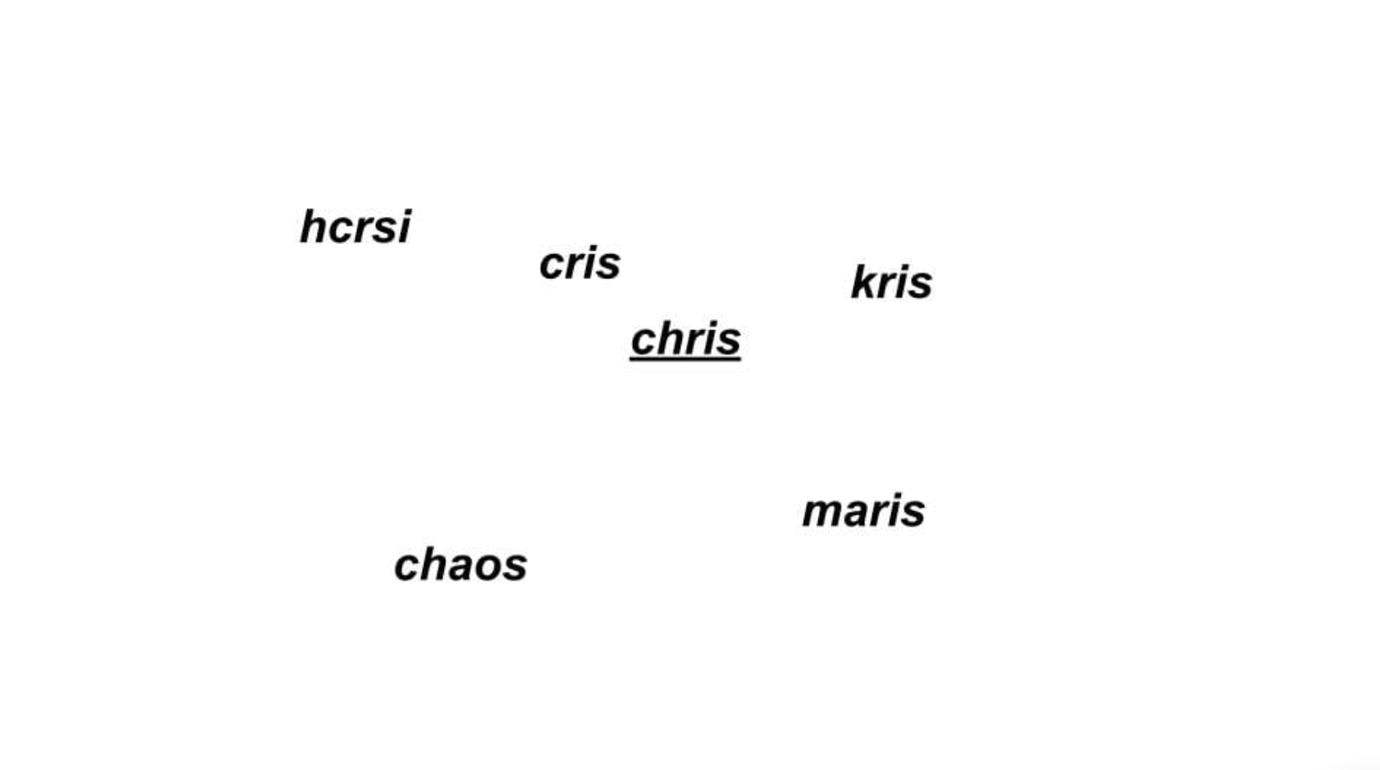Consider the following set of words, “chris”, “cris”, “kris”, “maris”, “chaos”, and “hcrsi”:
