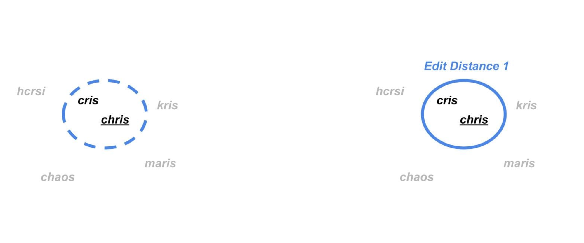 Consider a case where we only want to match “chris” and “cris” . We could simply say that any two words that are within a (Damerau-Levenshtein) edit distance of 1 should match, which would only group those two: