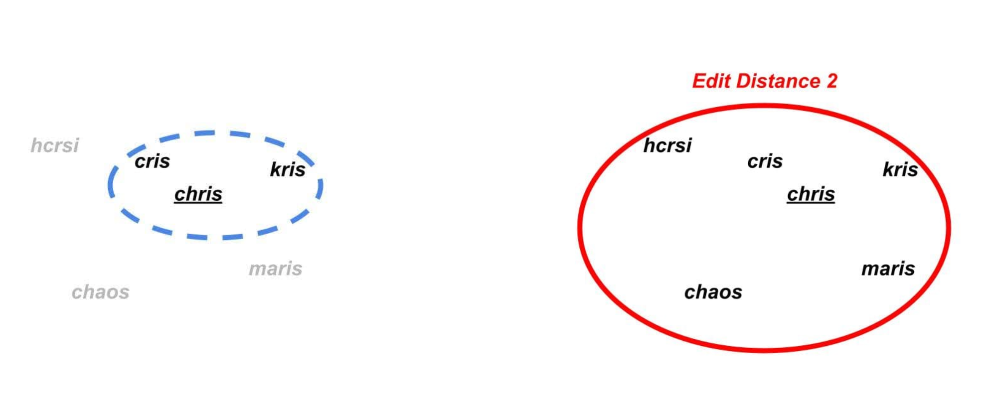 However, if we wanted to cast a slightly broader net and use edit distance to group “chris”, “cris” and “kris”, we would have to allow an edit distance of 2 in response. In doing so, we would find that “chris” matches every single one of the words above! I.e.