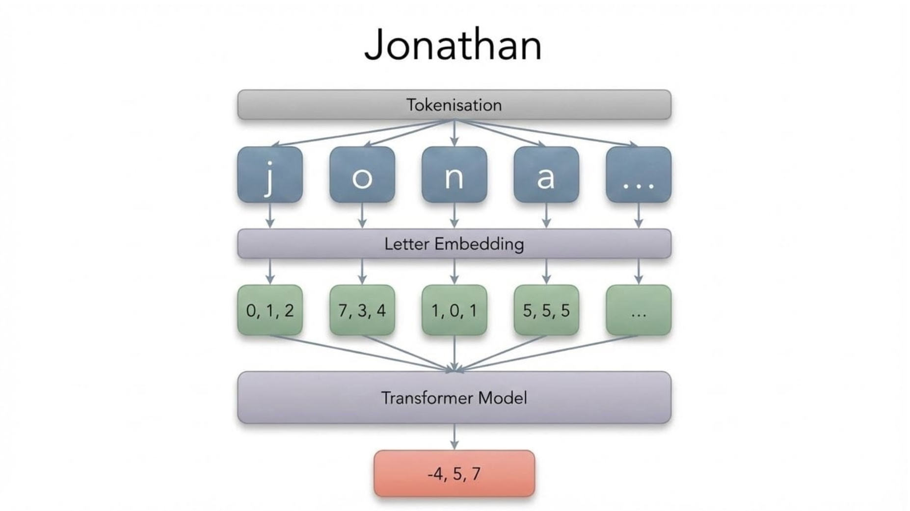 To turn a name into an embedding, we first break it down into components or "tokens". Multiple tokenisation schemes are possible, and we chose to break names down into their component letters, which were each given their own embedding. This series of letter embeddings was then fed into a 100,000 parameter, transformer-based model to produce a word embedding.