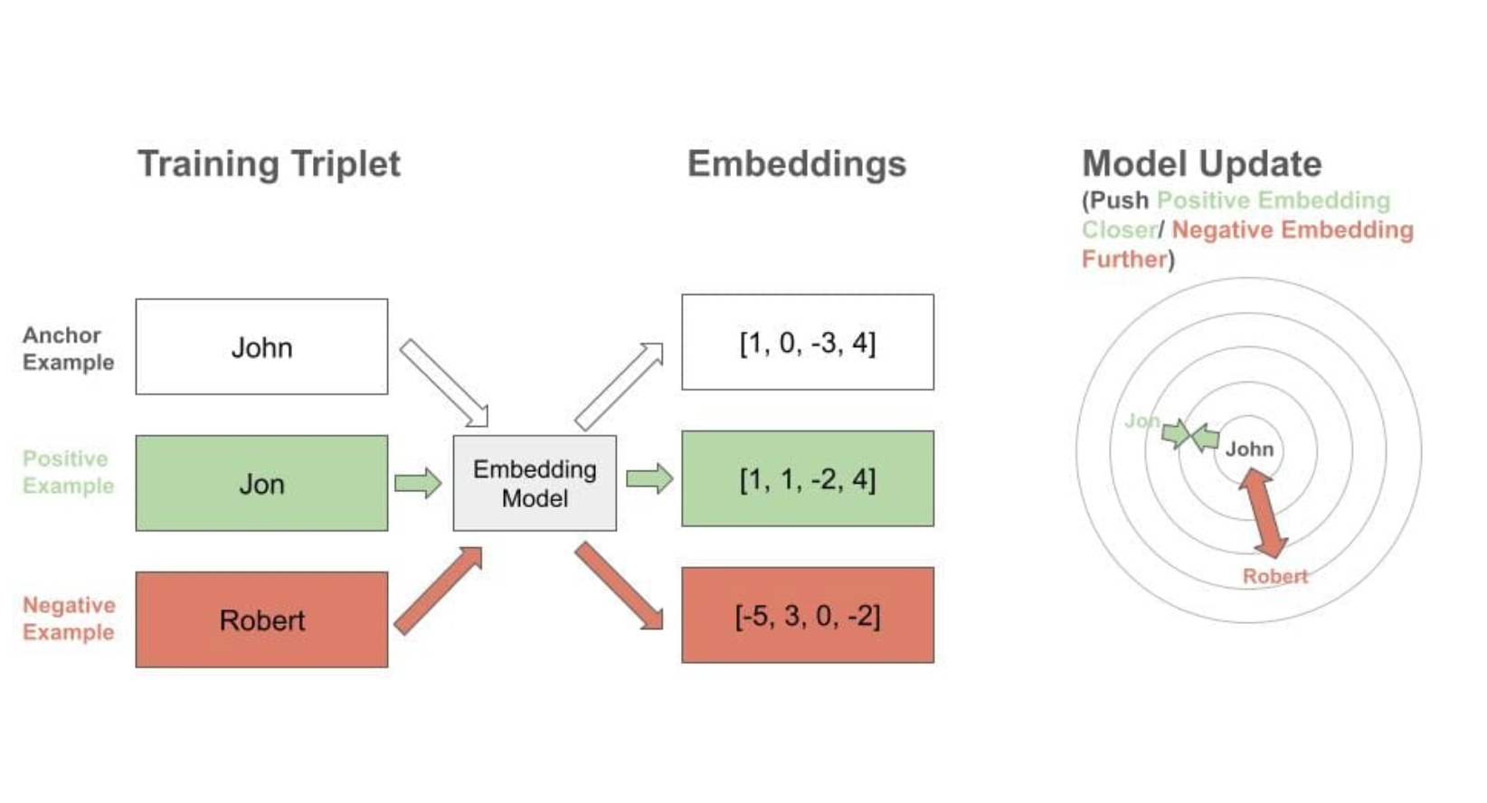 Of course, a name embedding is only useful if similar names are given similar embeddings. To ensure this, a triplet loss based training scheme was used - the model is presented with an “anchor” example name, and matching "positive" name, and a mismatching "negative" name. The embeddings of each are calculated, and then adjusted to move the anchor and "positive" name embeddings closer together, and the anchor and "negative" name embeddings further apart.