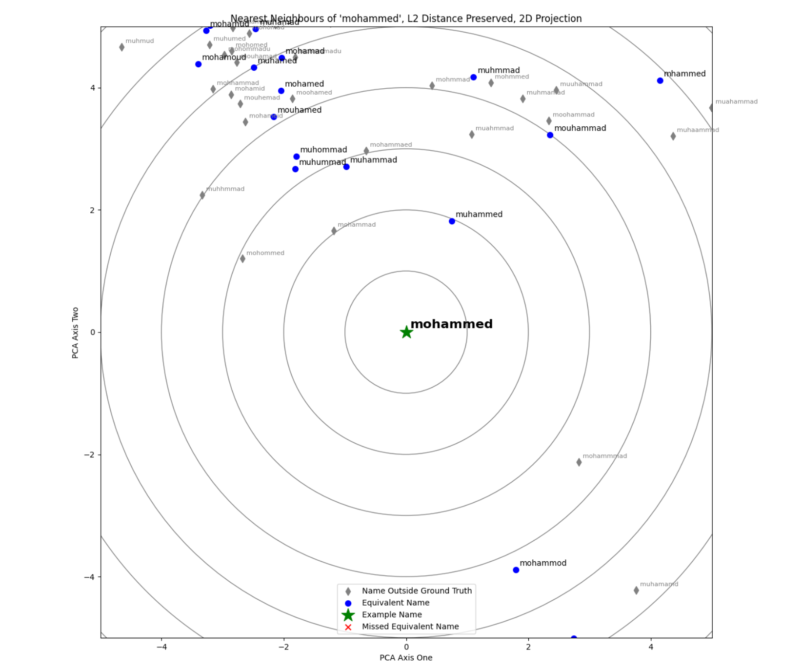 As words like “chaos” are unlikely to be a relevant match to “chris”, expanding our fuzzy matching system has allowed through significant additional noise. The problem we have run into with the example above is that, for a given fuzzy matching technique, we can struggle to distinguish a “good” match from a “bad” one – to an edit distance-based matching system, “kris” and “chaos” are both equivalent edit distance 2 matches to “chris”. This is especially problematic because there are tens of thousands of 5-letter words within an edit distance 2 from “chris”, most of which are not equivalent names.