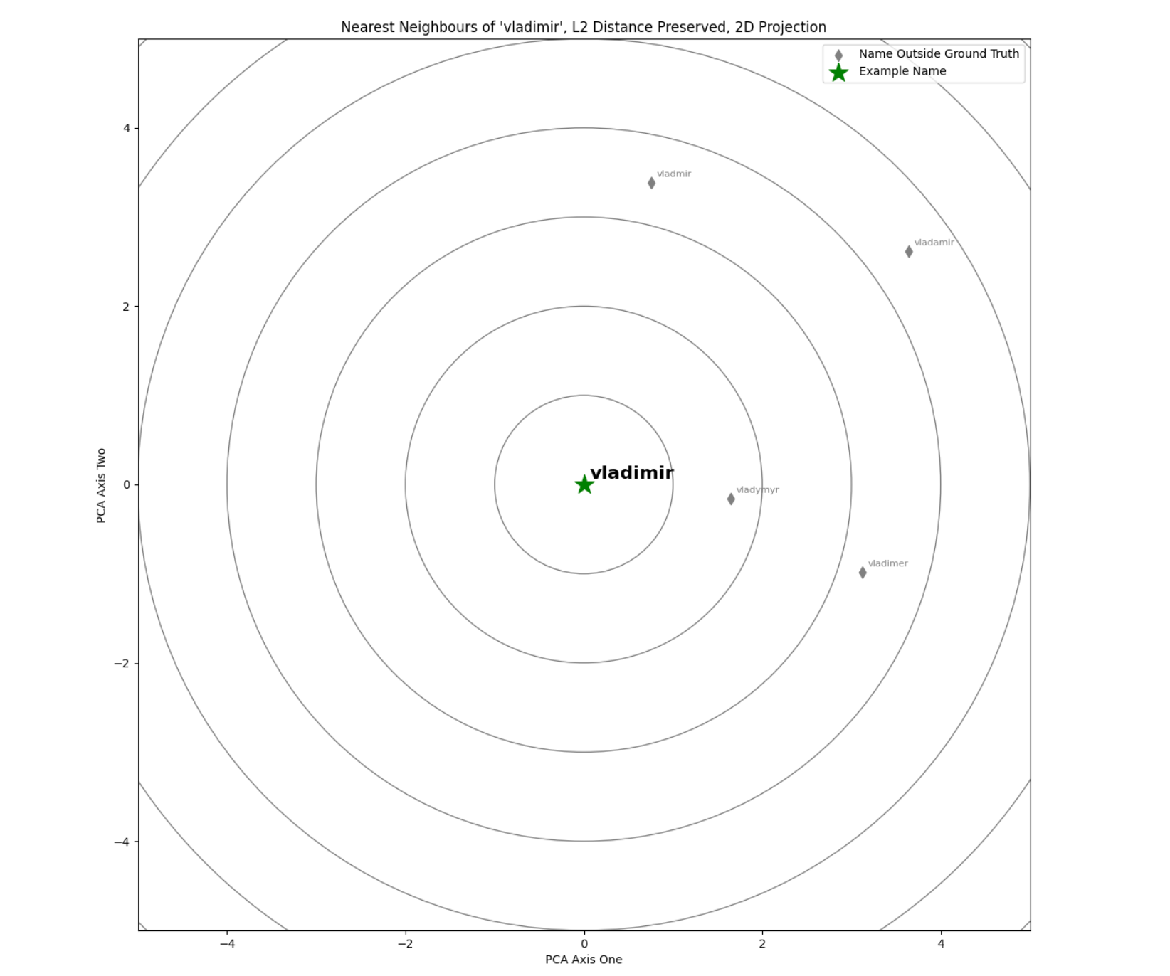 The actual vector space has a much higher number of dimensions, but has been compressed down to 2D for ease of visualisation. Nearest neighbours are defined according to L2 Euclidean distance, and this distance between the example word and its nearest neighbours in the vector space has been preserved in the 2D transformation.
