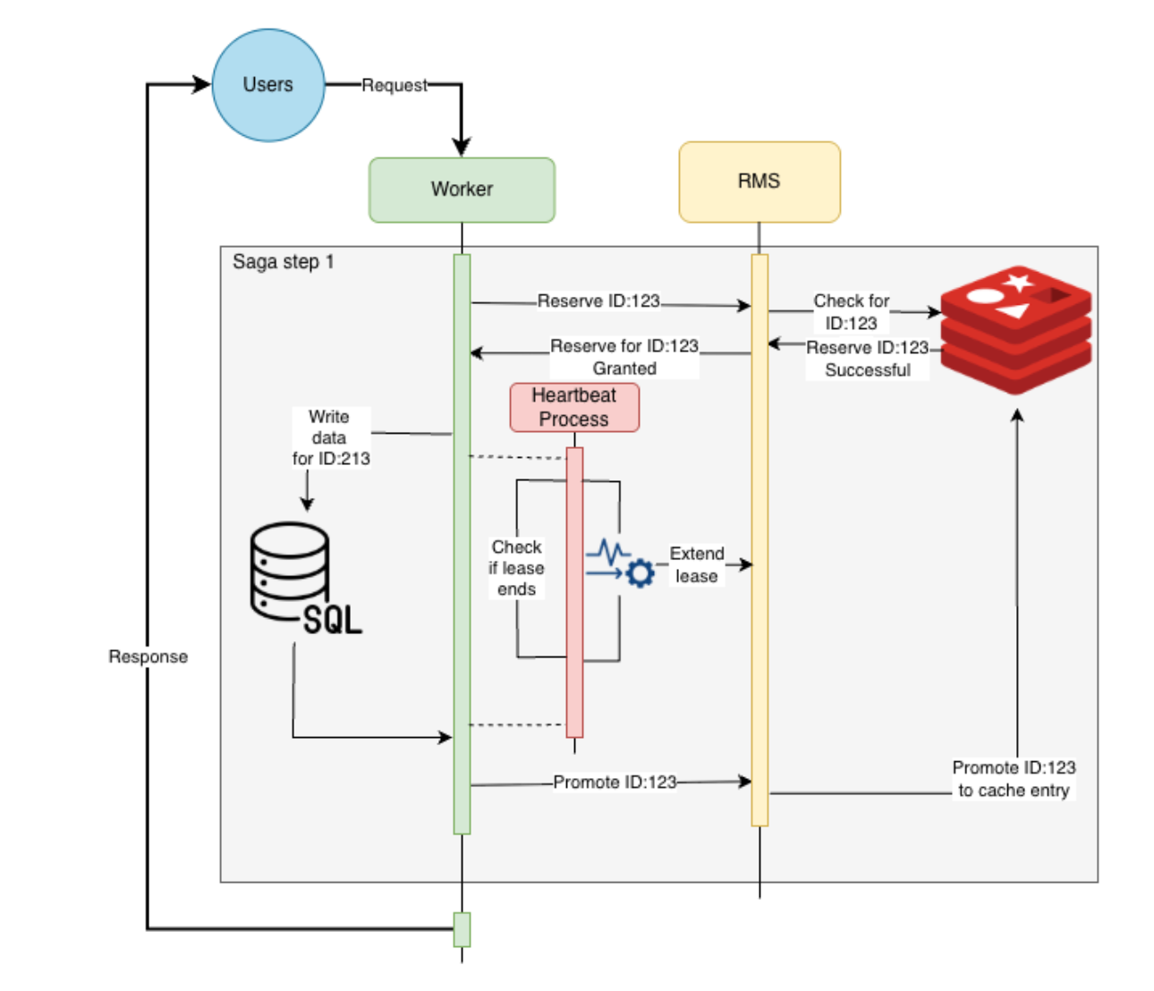 - On Failure: If the database operation fails, or the heartbeat fails to extend the lease (e.g., the worker dies), the lock will eventually expire, allowing other requests to proceed. The saga fails, and a compensating recovery process can be invoked.