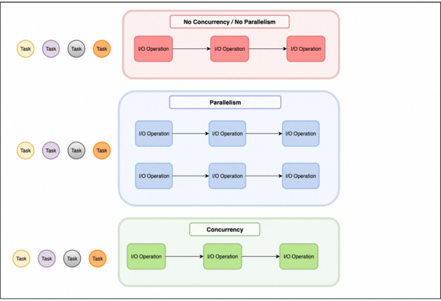 When managing computational tasks, there are three fundamental approaches to consider: sequential processing, parallelism, and concurrency, each handling tasks in a different way as illustrated in the image above.
